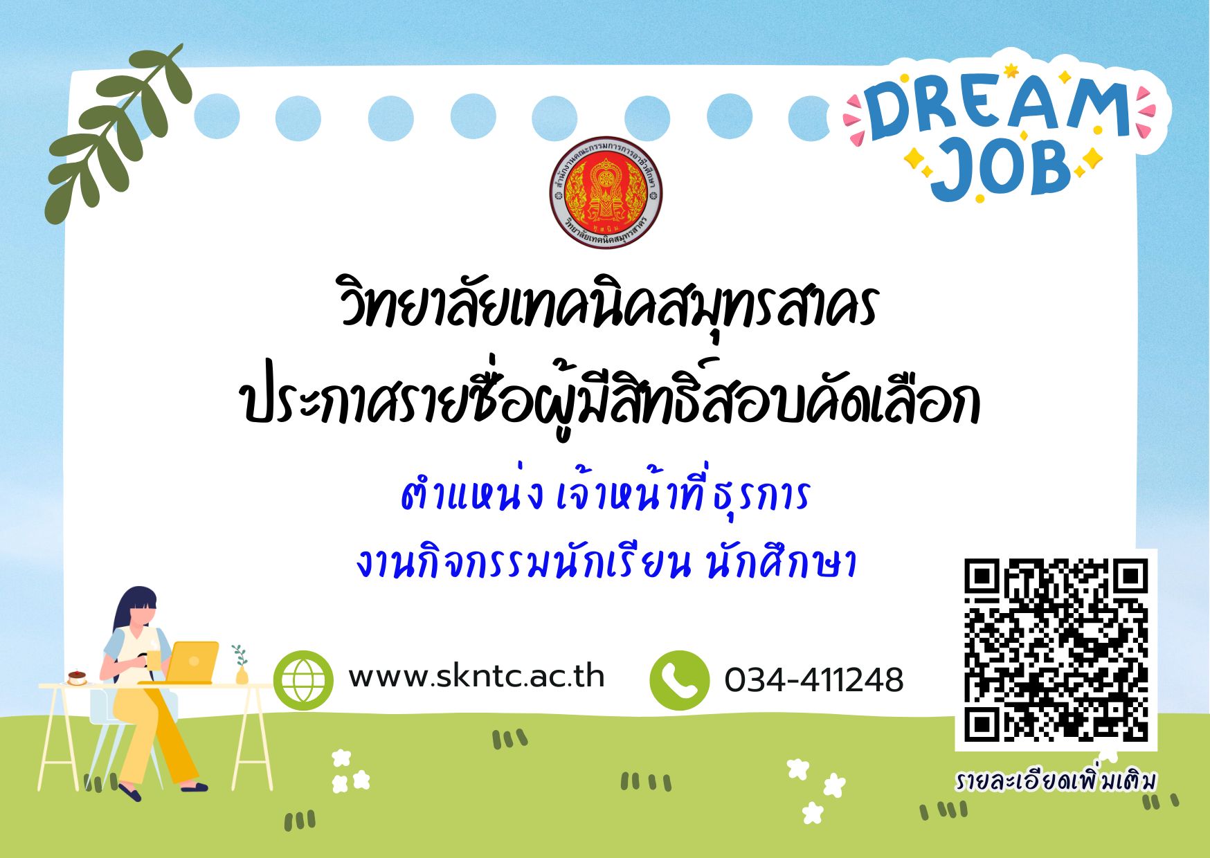 ประกาศรายชื่อผู้มีสิทธิ์สอบคัดเลือก ตำแหน่ง เจ้าหน้าที่ธุรการ (งานกิจกรรมนักเรียนนักศึกษา)