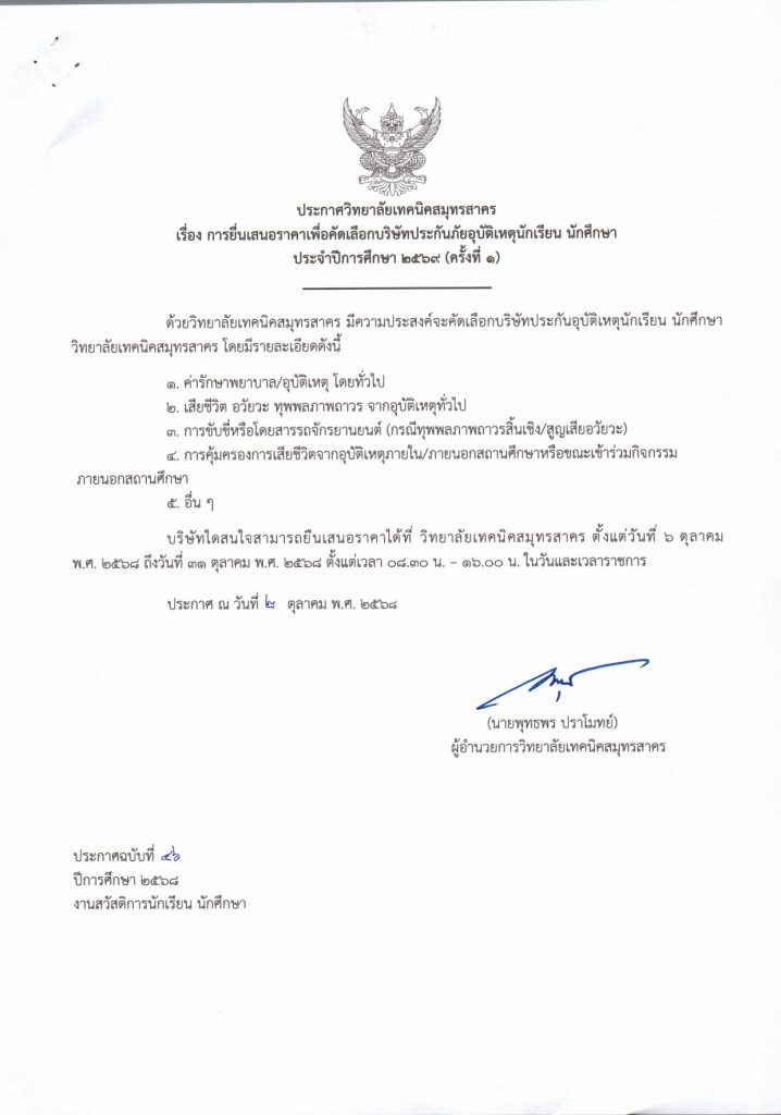 เรื่อง การยื่นเสนอราคาเพื่อคัดเลือกบริษัทประกันภัยอุบัติเหตุนักเรียน นักศึกษา