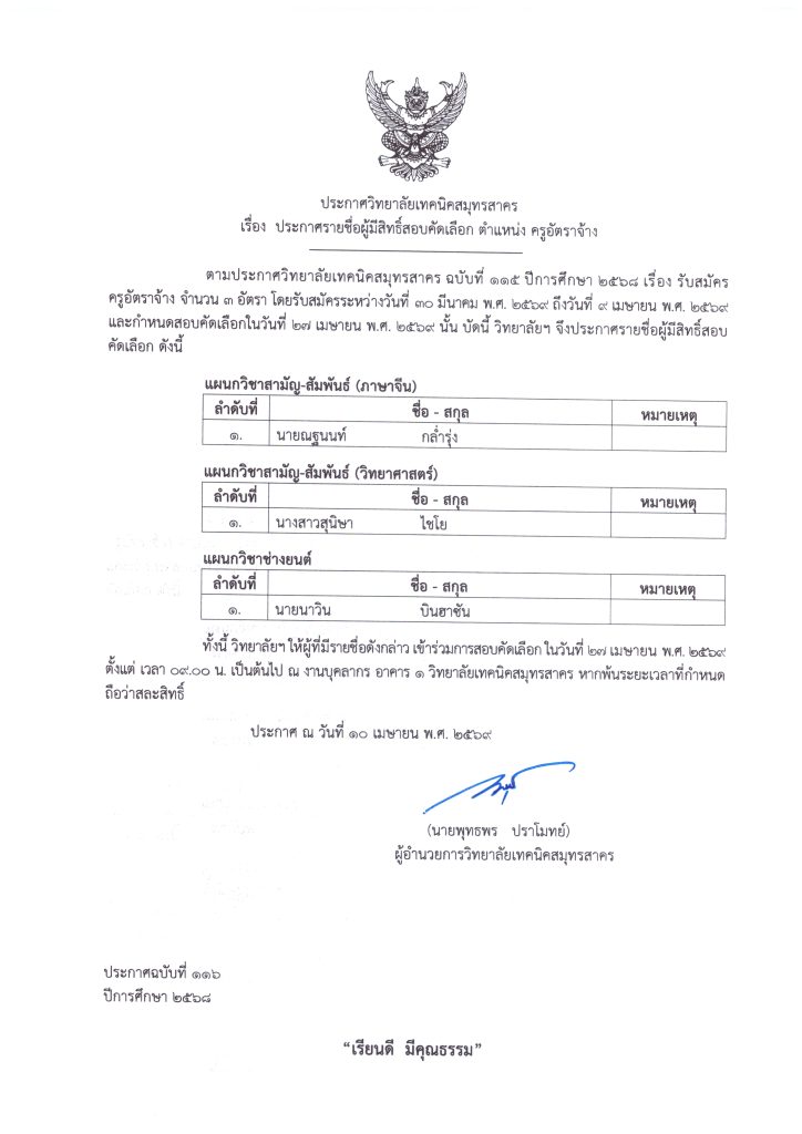 ประกาศรายชื่อผู้มีสิทธิ์สอบคัดเลือก ตำแหน่ง ครูอัตราจ้าง