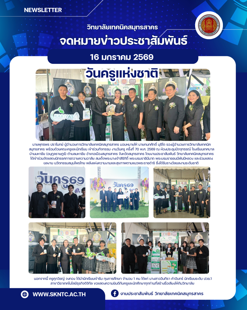 นายพุทธพร ปราโมทย์ ผู้อำนวยการวิทยาลัยเทคนิคสมุทรสาคร มอบหมายให้ นายกนกศักดิ์ มุธิโต รองผู้อำนวยการวิทยาลัยเทคนิคสมุทรสาคร พร้อมด้วยคณะครูและนักเรียน เข้าร่วมกิจกรรม งานวันครู ครั้งที่ 70 พ.ศ. 2569 ณ ห้องประชุมปัจจุทธรณ์ โรงเรียนเทศบาลบ้านมหาชัย (อนุกูลราษฎร์) ตำบลมหาชัย อำเภอเมืองสมุทรสาคร จังหวัดสมุทรสาคร